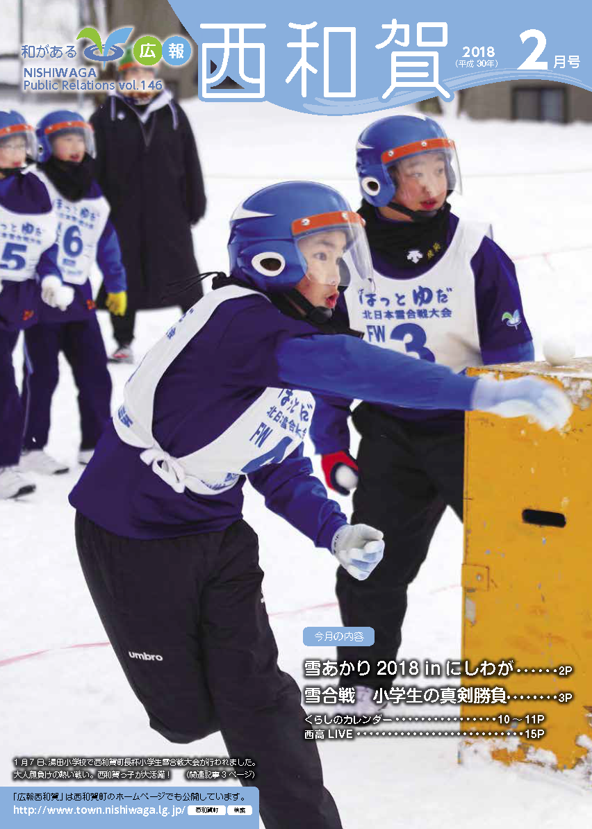 2月号[カラー20ページ] 〈表紙〉西和賀町長杯小学生雪合戦大会 雪あかり2018inにしわが 雪合戦 小学生の真剣勝負 西高LIVE |