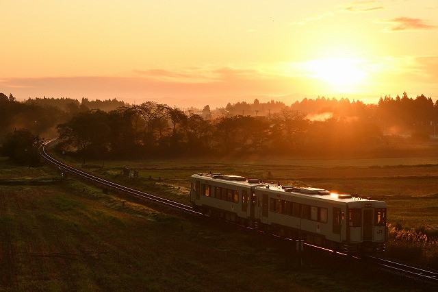 | 「錦秋の北上線を行く」 岩手県花巻市 宮前 行男さん | 「朝日に向かう始発列車」 岩手県花巻市 宮前 妙子さん |